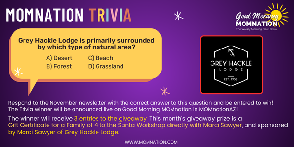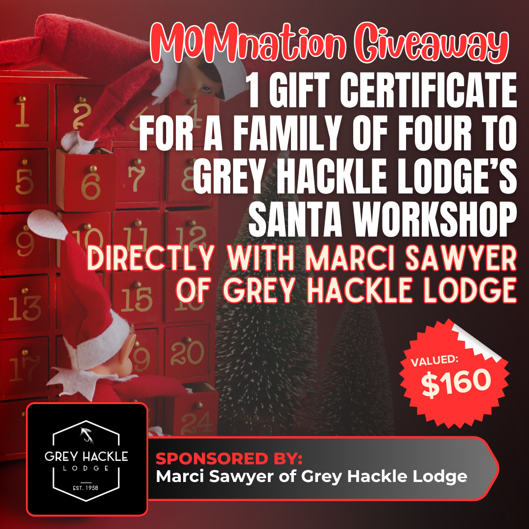 This month's giveaway prize is a Gift Certificate for a Family of 4 to the Santa Workshop with Marci Sawyer of Grey Hackle Lodge