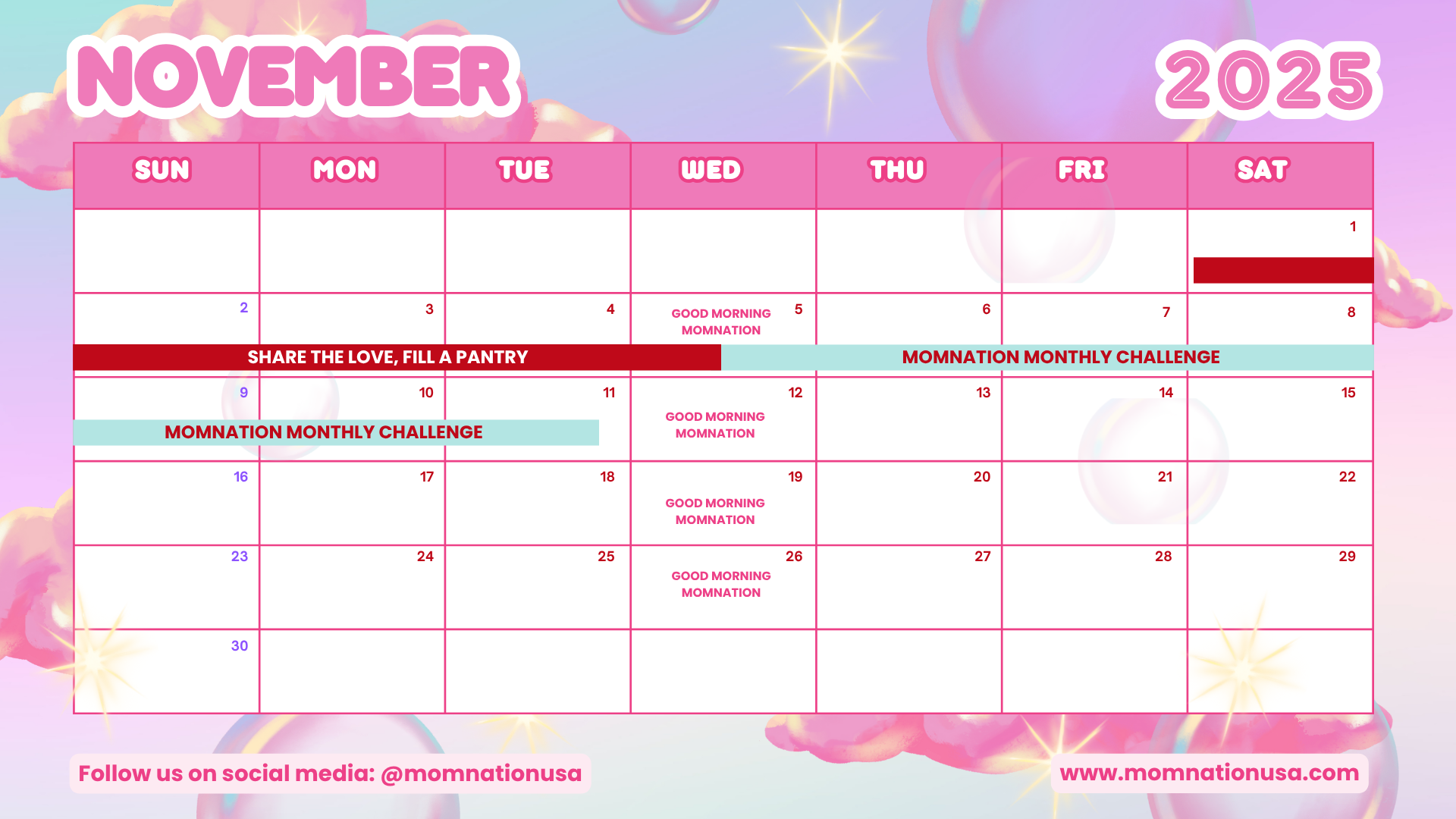 🎉 November Challenge Dates: November 5th – November 11th 🎉 🏆 Winner Announced: November 12th during Good Morning MOMnation LIVE! 🏆 ✨ Ready to pause, breathe, and find your calm? Join our Monthly Challenge starting the first Wednesday of the month and running through the following Tuesday! 💖 This Month’s Challenge: 💖 👉 MINDFUL MOMENTS 👈 Take 5 minutes each day to practice deep breathing, meditation, or mindfulness. How to Participate: