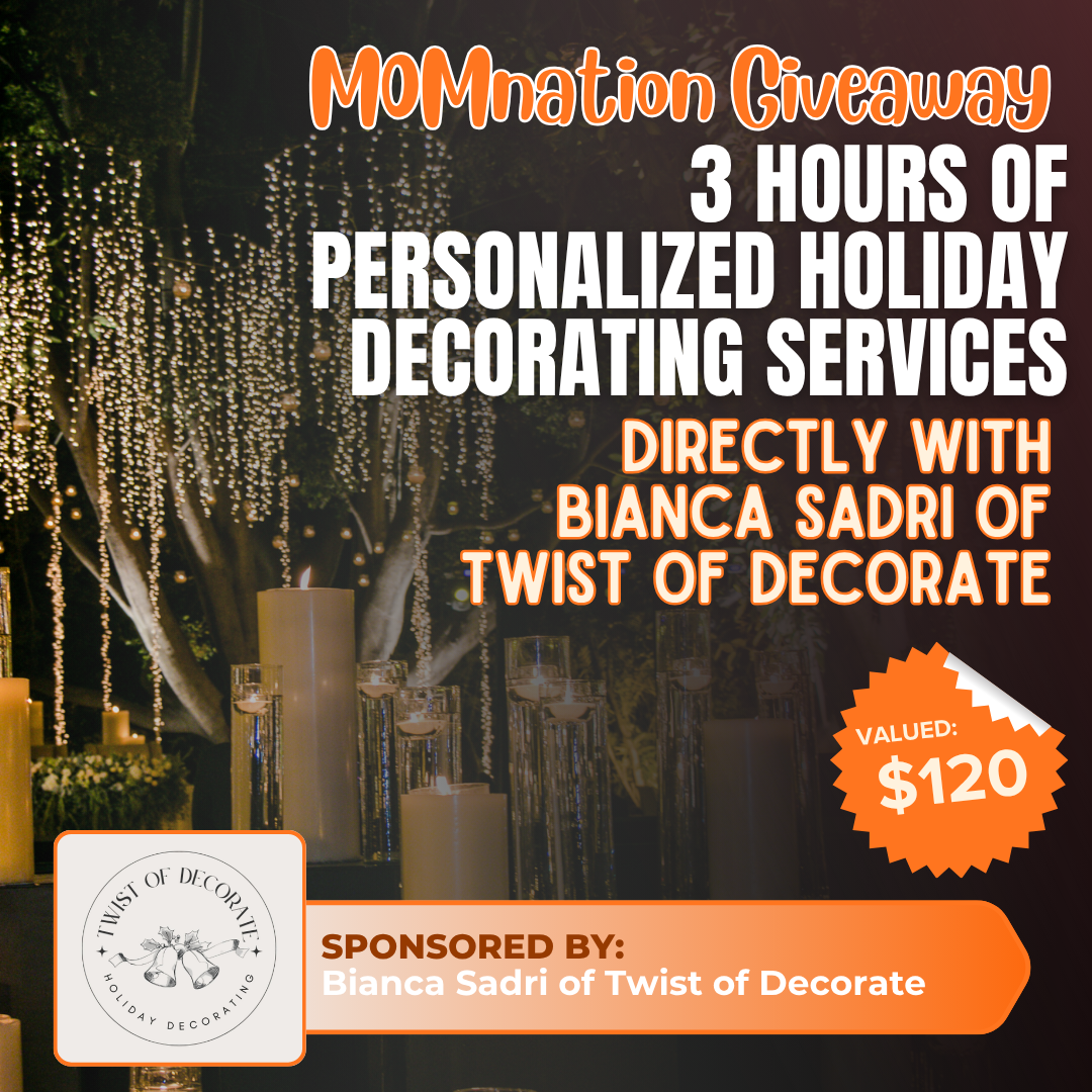 This month's giveaway prize is a 3 HOURS of Personalized Holiday Decorating Services with Bianca Sadri of Twist of Decorate